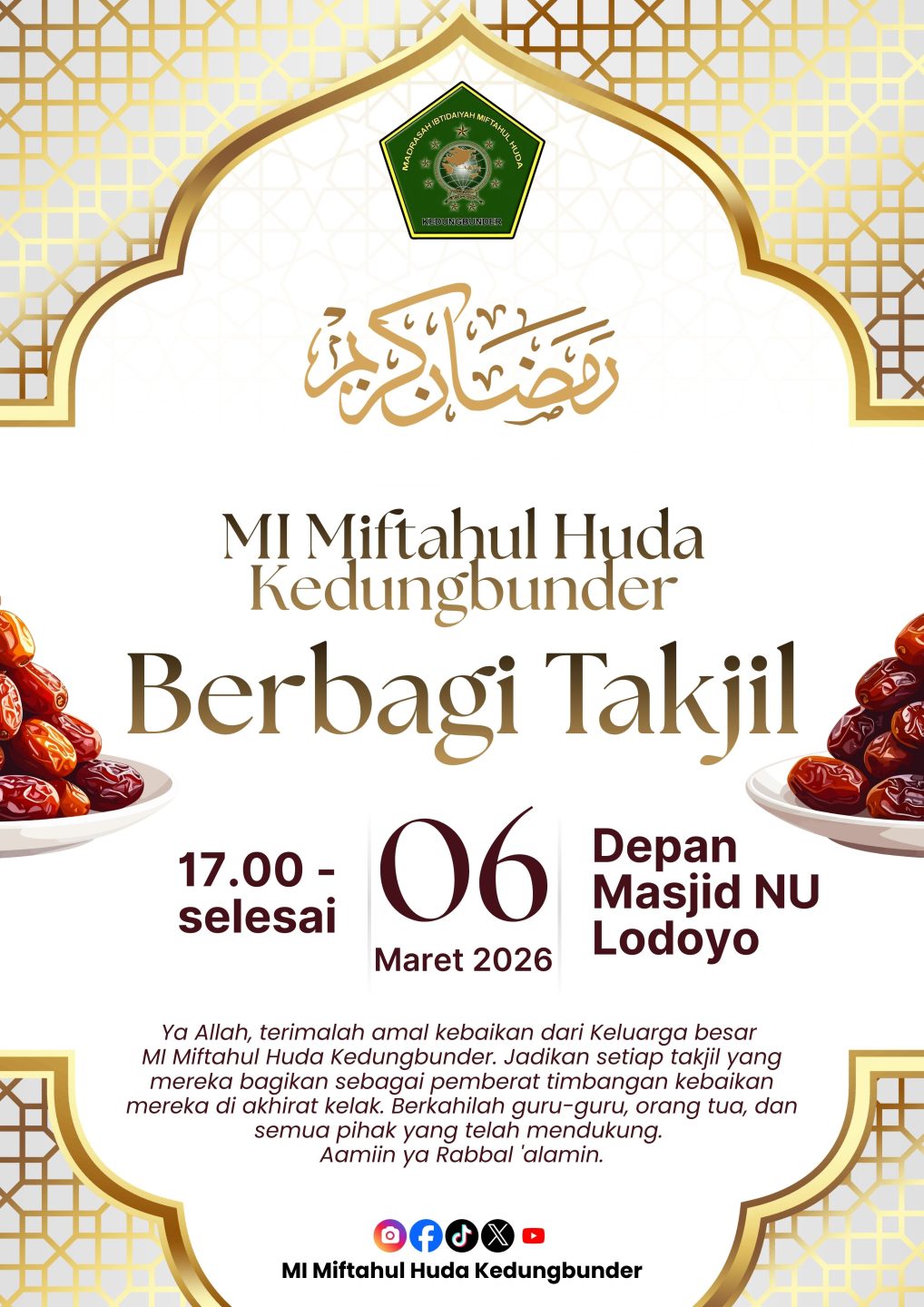 Dalam rangka memeriahkan bulan suci Ramadhan 1447 H, Keluarga Besar MI Miftahul Huda Kedungbunder mengadakan kegiatan Berbagi Takjil yang dilaksanakan pada 06 Maret 2026, bertempat di Depan Masjid NU Lodoyo, dimulai pukul 17.00 WIB hingga selesai. Kegiatan ini bertujuan untuk menumbuhkan rasa kepedulian sosial dan semangat berbagi kepada masyarakat, khususnya para pengguna jalan dan jamaah yang hendap berbuka puasa. Takjil yang dibagikan merupakan hasil partisipasi dari para guru, siswa, dan orang tua wali murid sebagai wujud kebersamaan dalam kebaikan di bulan yang penuh berkah. Diharapkan kegiatan ini menjadi amal jariyah yang diterima di sisi Allah SWT, serta mempererat silaturahmi antara madrasah dan masyarakat sekitar.